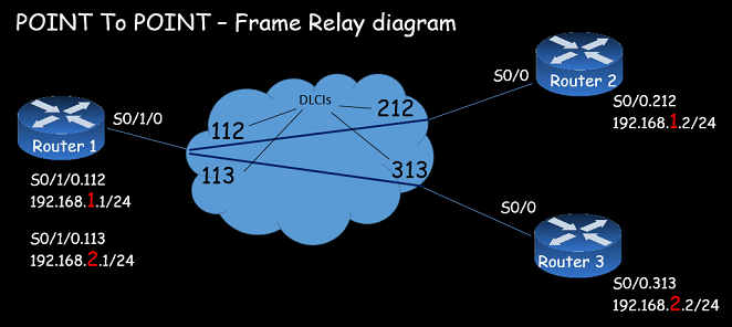 Router 1 Congiguration In Global configuration mode - Router 1, type: Router 2 Congiguration In Global configuration mode - Router 2, type: Router 3 Congiguration In Global configuration mode - Router 3, type: A configured routing protocol will advertise the connecting links Useful Show Commands       show frame-relay lmi       // frame-relay management language used - and further details      show frame-relay map       show frame-relay pvc       show ip interface brief |