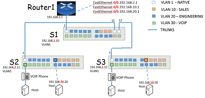 Please refer to the below diagram for this example. We connect three switches and a Router using trunk ports. These switches will support three VLANs. The native VLAN 1 ( us for trunk ports) and two additional VLANs, VLAN 10 and VLAN 20. Colour codes are used to indicate that VLANs can span multiple switches depending on configuration requirements. Configuration of port 7 on S2 and port 8 on S3 are described below. Static IP addresses have been assigned on these hosts.